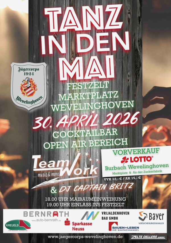 Nach dem großen Erfolg der vergangenen Jahrzehnte bringt Euch das Jägercorps 1924 Wevelinghoven auch in diesem Jahr wieder eine liebgewonnene Tradition in die Gartenstadt. Am 30. April 2026 wird der Marktplatz in Wevelinghoven zum Schauplatz des traditionellen Tanz in den Mai.